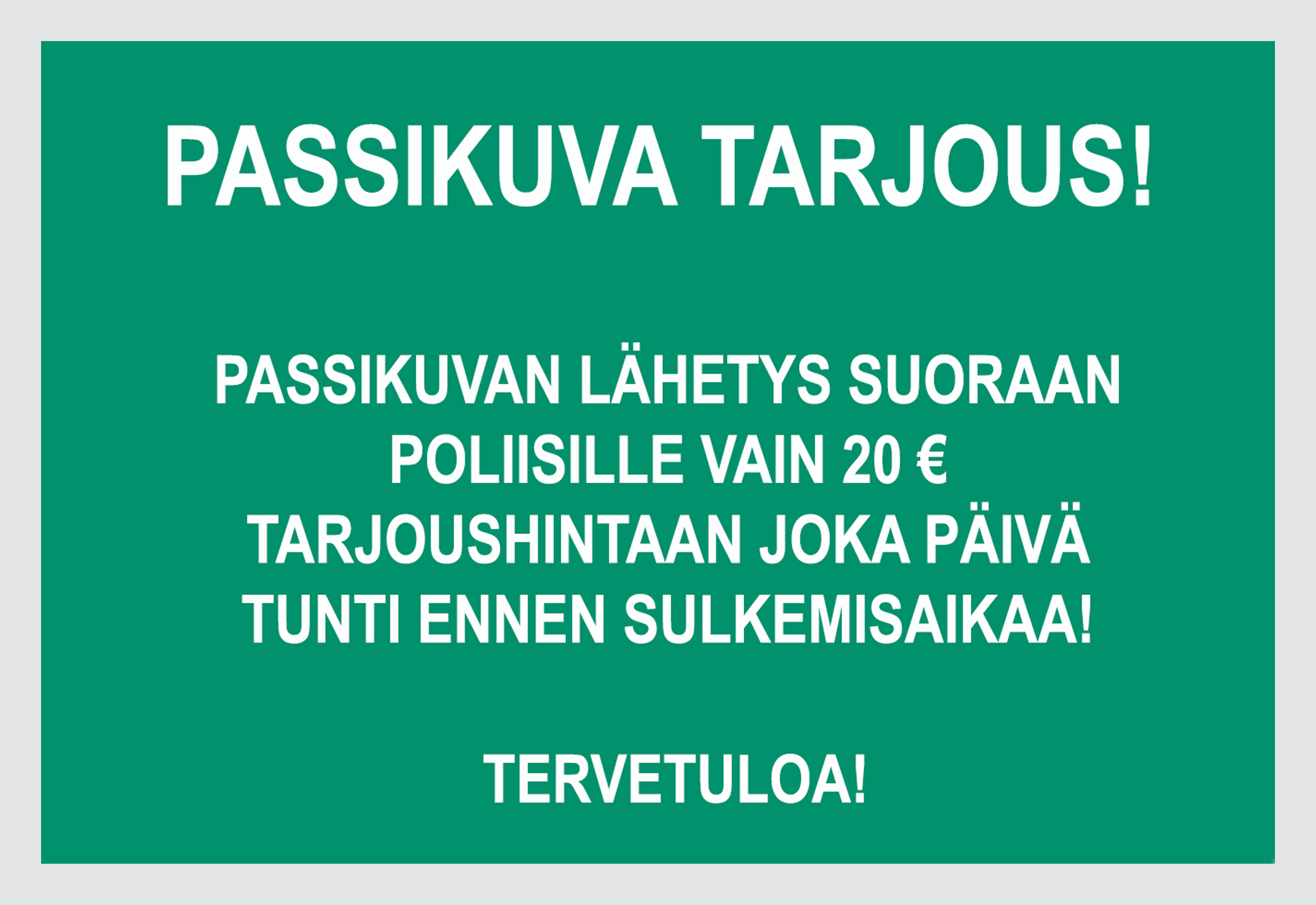 Tarjoamme erikoiskoonpassikuvia sekä sähköisiä passikuvia, jotka lähetetään suoraan valokuvaliikkeestämme Poliisin lupajärjestelmään. Sijaitsemme Helsingissä, Kaartinkaupungissa, ja meidät on helppo löytää. Meillä on yli 20 vuoden kerryttämä kokemus ja asiantuntemus passikuvien ja erikoispassikuvien parissa. Passikuvamme nauttivat täydellisestä takuusta.