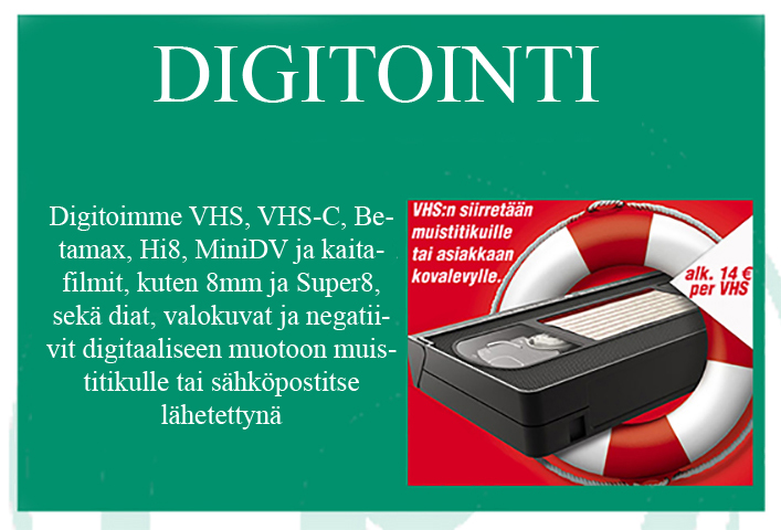 Digitointi tapahtuu meillä nopealla aikataululla ja ensiluokkaisella laadulla. Meiltä löydät kaupungin parhaimman hinta-laatusuhteen. Ikuista arvokkaat videoarkistot digitaaliseen muotoon, jotta ne säilyvät tuleville sukupolville. Digitoitu aineisto siirretään näppärästi muistitikuille tai asiakkaan kovalevylle. Tarjoamme digitointia monille erilaisille formaateille, kuten VHS, VHS-C, BETAMAX, Hi8 ja MiniDV-kaseteille, sekä kaitafilmeille, mukaan lukien 8 mm ja Super 8. Digitointipalvelumme kattaa myös diojen, negatiivien ja valokuvien digitoinnin. Käytössämme ovat ammattilaistason laitteet, kuten Frontier FUJI:n kalusto. 35 mm negatiivit ja positiiviset filmit skannataan huolella Fujifilm SP 2000 -skannerilla. Valokuvista voit valita värilliset tai mustavalkoiset vaihtoehdot.